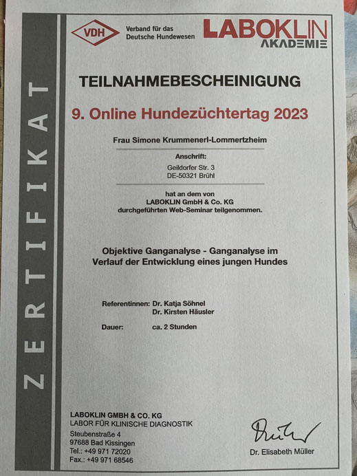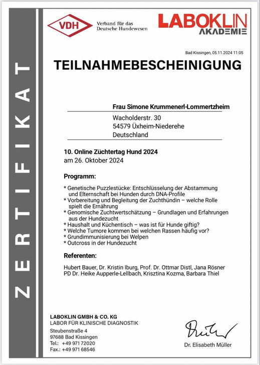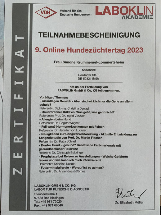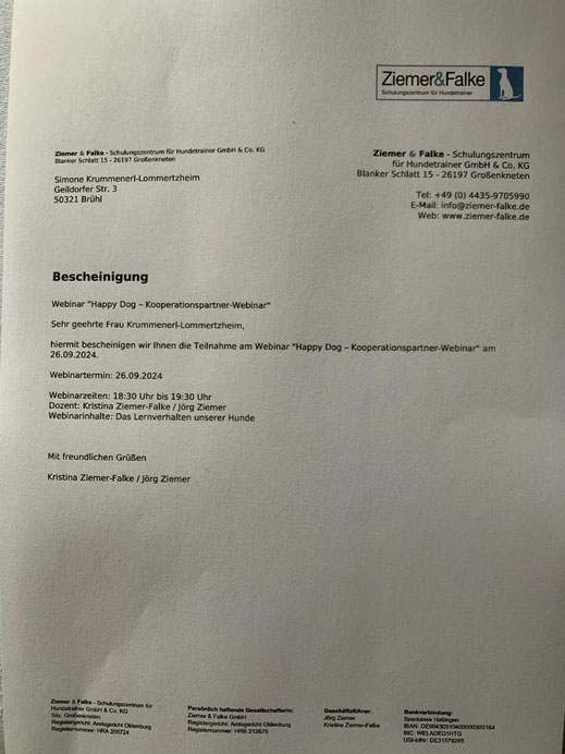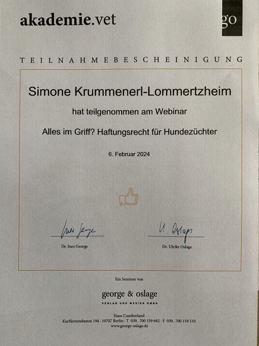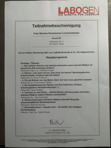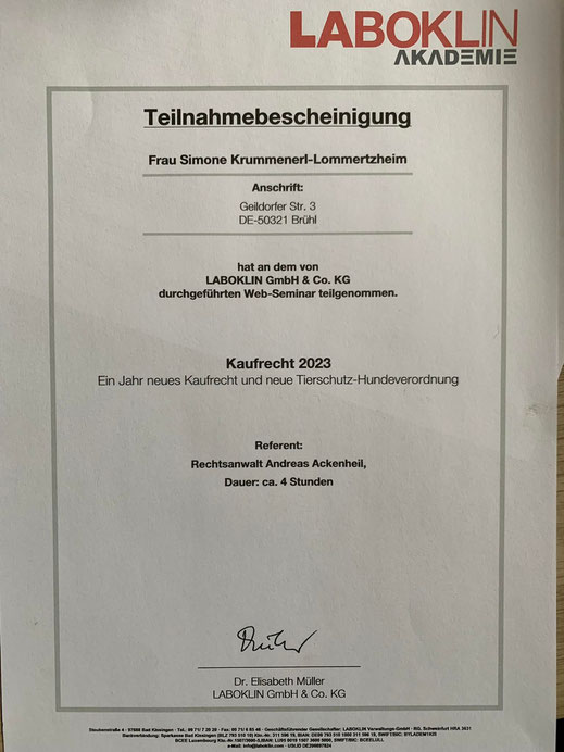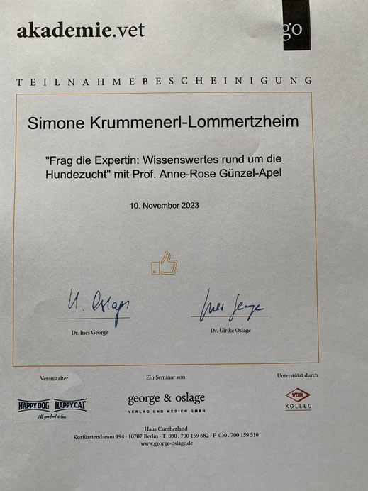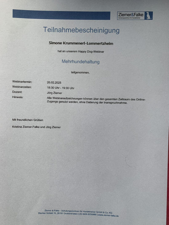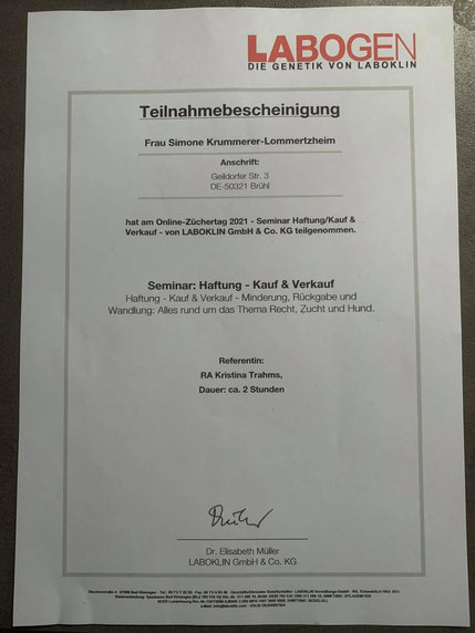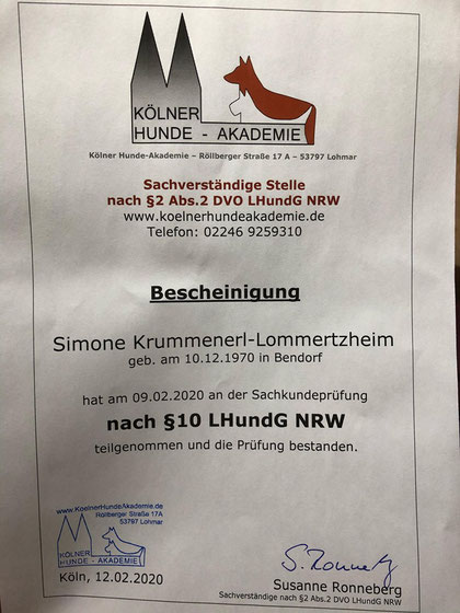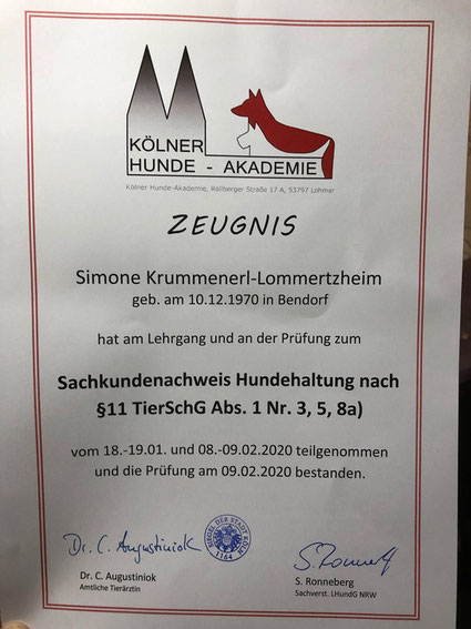Am 18./ 19. Januar und am 08./09. Februar 2020 nahm ich an einem Lehrgang der "Kölner Hunde-Akademie/ Akademie für Tierhaltung" teil und bestand am 09. Februar, im Anschluss an den Lehrgang, die Prüfung unter Aufsicht einer Amtstierärztin.
