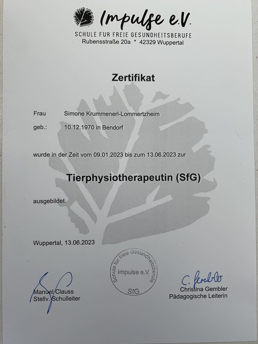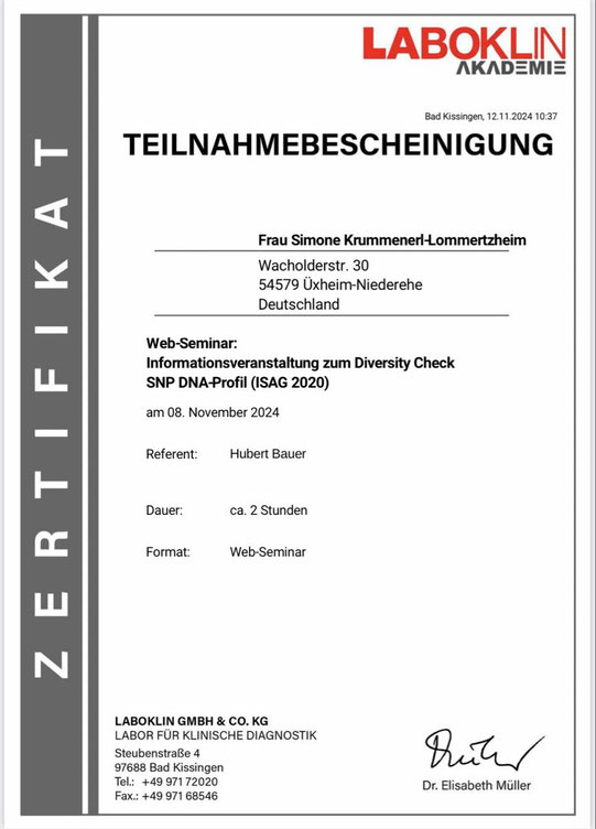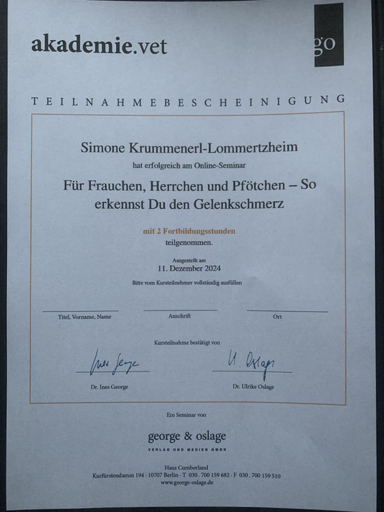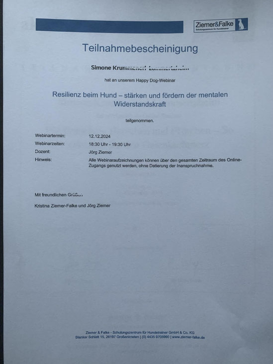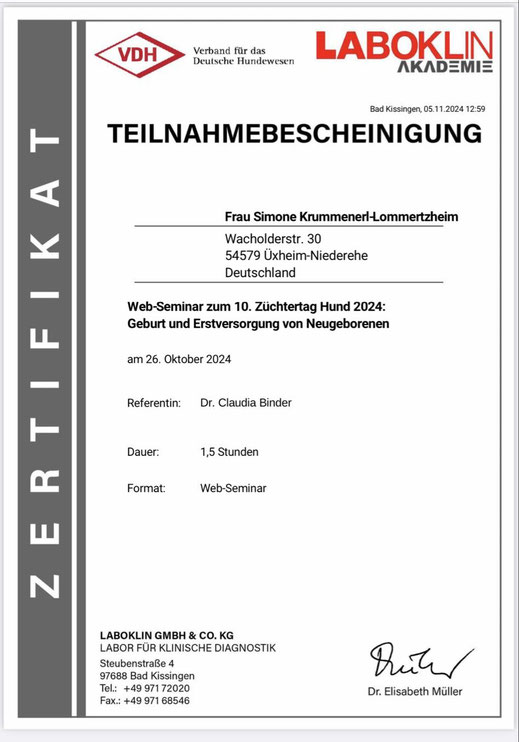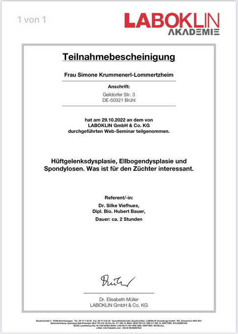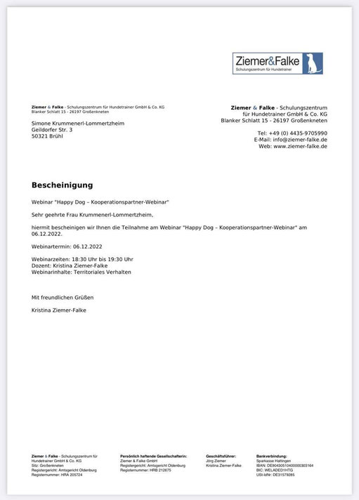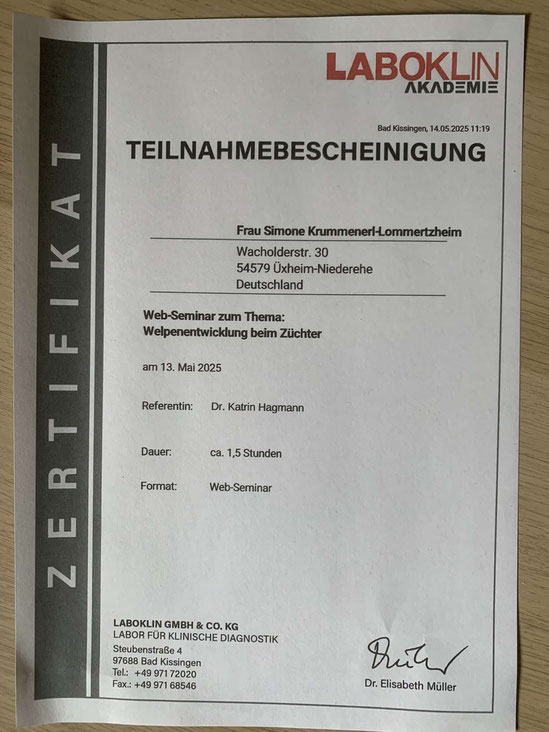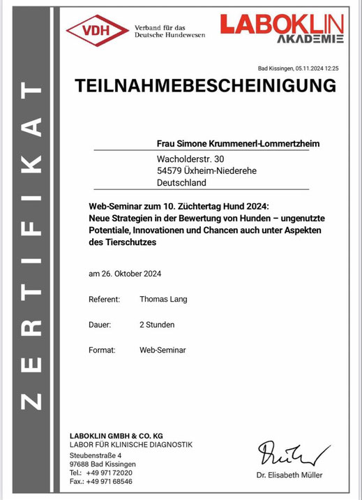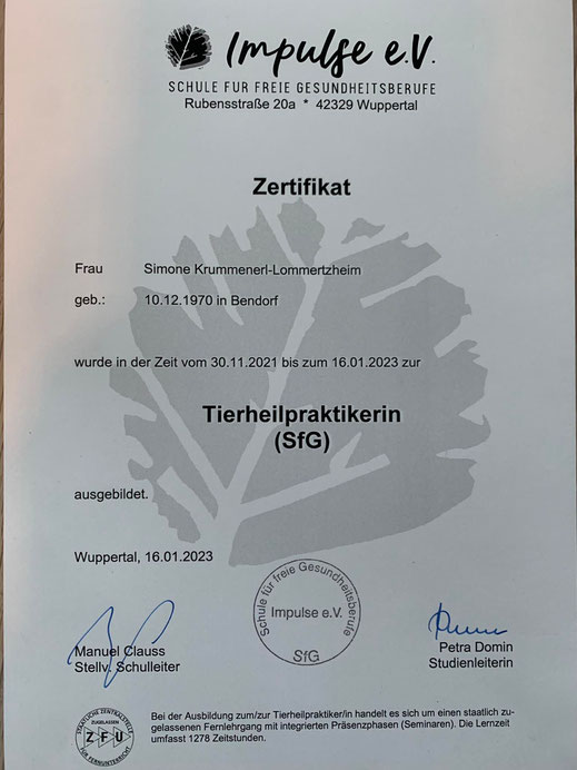 Am 18./ 19. Januar und am 08./09. Februar 2020 nahm ich an einem Lehrgang der "Kölner Hunde-Akademie/ Akademie für Tierhaltung" teil und bestand am 09. Februar, im Anschluss an den Lehrgang, die Prüfung unter Aufsicht einer Amtstierärztin.